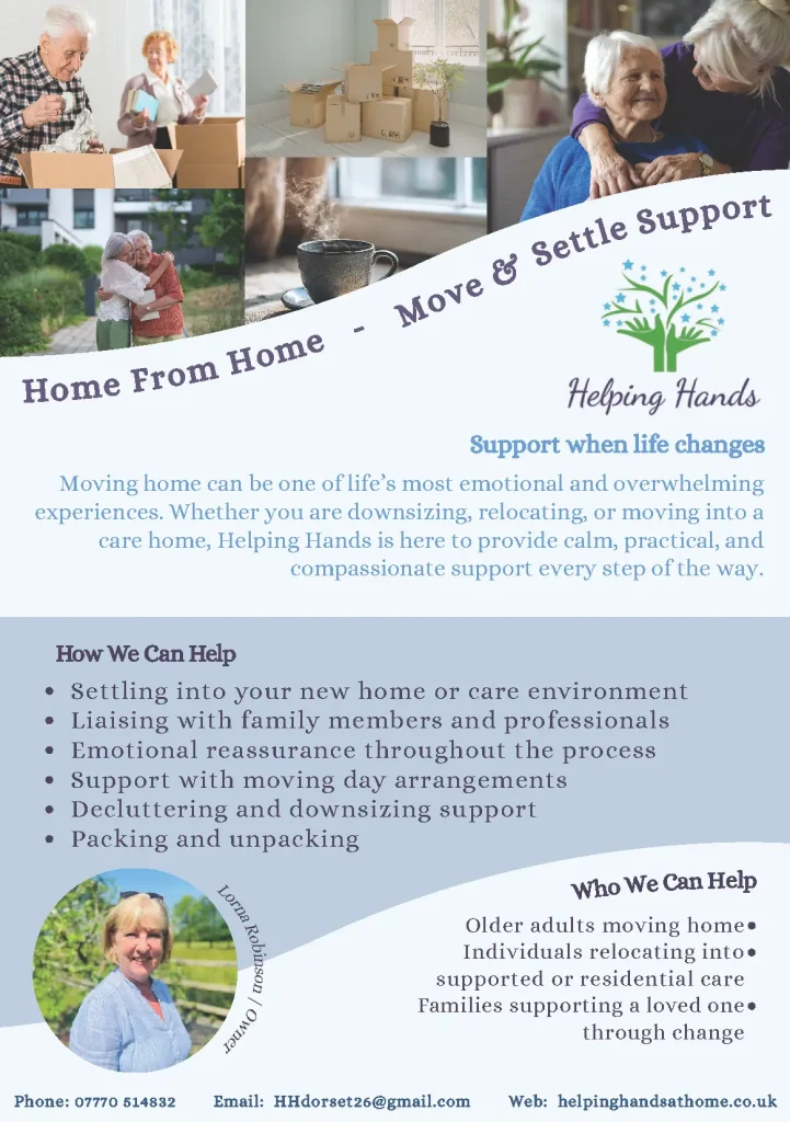 Support when life changes Moving home can be one of life’s most emotional and overwhelming experiences. Whether you are downsizing, relocating, or moving into a care home, Helping Hands is here to provide calm, practical, and compassionate support every step of the way. How we can help Who We Can Help Warmly,LornaHelping Hands