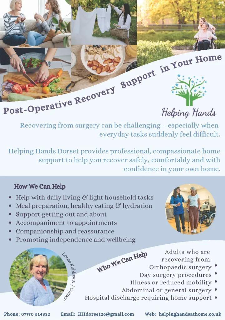 Recovering from surgery can be challenging – especially when everyday tasks suddenly feel difficult. Helping Hands Dorset provides professional, compassionate home support to help you recover safely, comfortably and with confidence in your own home. How we can help Who We Can Help Warmly,LornaHelping Hands